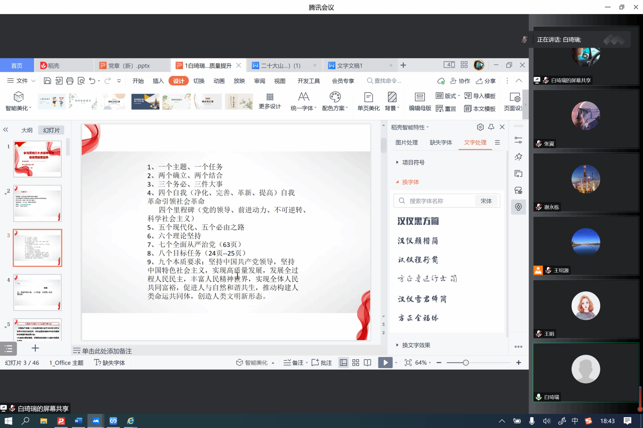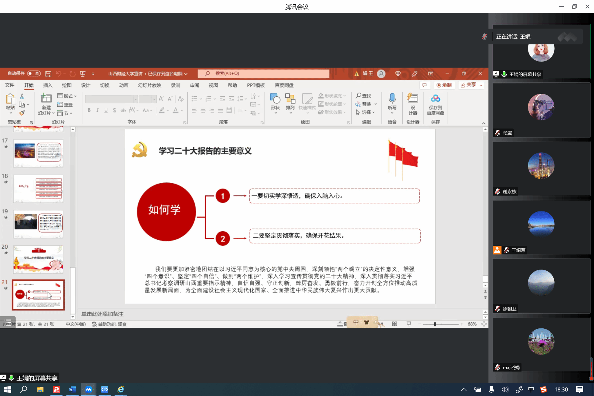 在集体备课会上,围绕学习宣传贯彻党的二十大精神这一主题主线,yl7703永利集团官网王娟老师、白琦瑞老师分别就开展党的二十大精神宣讲的核心理念、内容要点、手段依循、方法依托等方面进行了导学。在此基础上,与会成员集中围绕学习阐释党的二十大精神这一主题,在宣讲内容、宣讲形式、宣讲方法等方面达成了思想共识,为接下来宣讲活动的开展奠定了坚实基础。