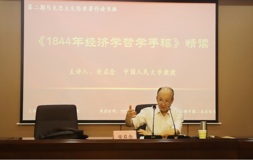 在接下来的五天时间中,安启念教授为学员们系统讲授马克思早期重要著作《1844年经济学哲学手稿》(又称《巴黎手稿》)。安教授指出《1844年经济学哲学手稿》是马克思主义形成阶段的重要著作,在这部书稿中马克思从唯物主义和共产主义的立场出发,对涉及哲学、政治经济学和共产主义理论的各种历史文献和思想观点进行了系统的批判性考察,在剖析资本主义经济制度和资产阶级经济学的过程中,提出了新的经济学观点、哲学观点和共产主义理论观点,并作了初步的综合性阐述。手稿的内容是马克思主义重要的经典著作,需要我们反复研读。