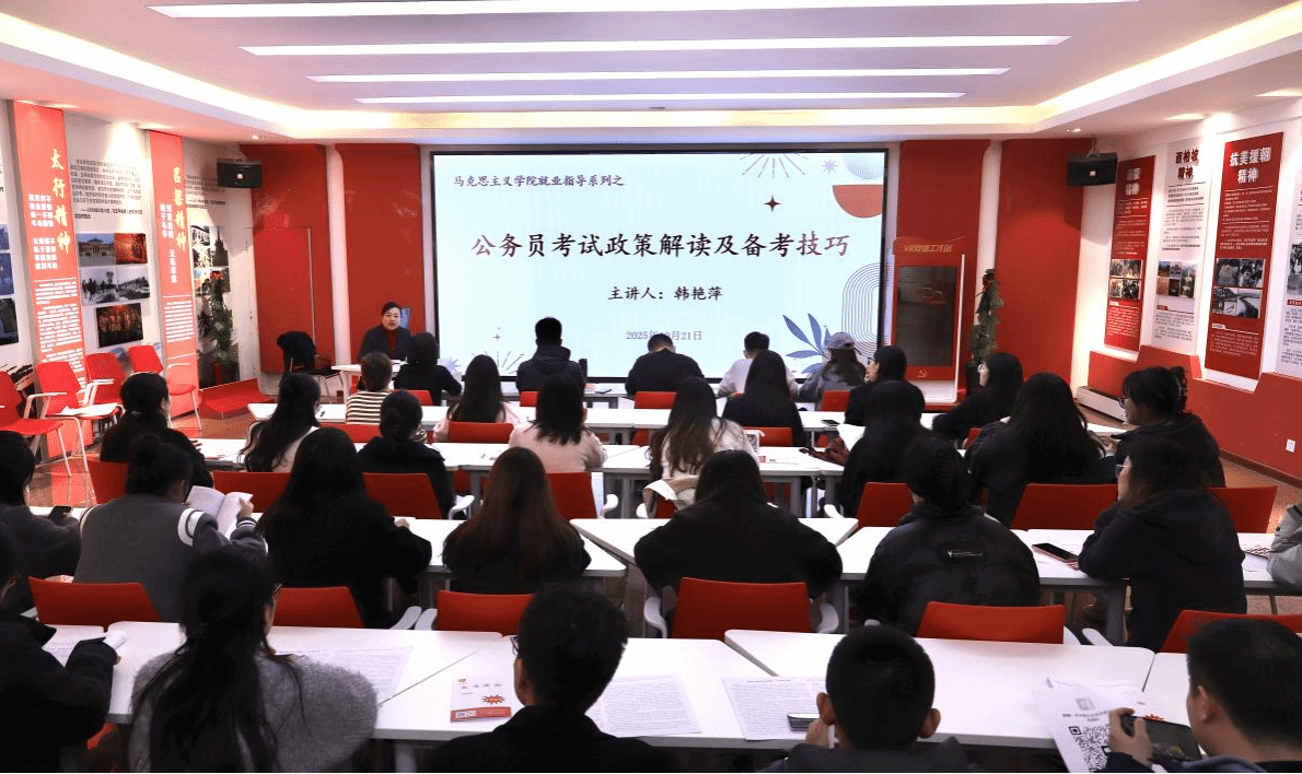 为更好提升就业指导服务,扎实推进毕业生高质量就业,10月21日下午,yl7703永利集团官网邀请太原市委党校科研处处长韩艳萍教授,在红色新青年成长领航馆作了题为“公务员考试政策解读及备考技巧”的专题辅导讲座。yl7703永利集团官网2026届全体毕业生参加学习,讲座由辅导员任智萍老师主持。