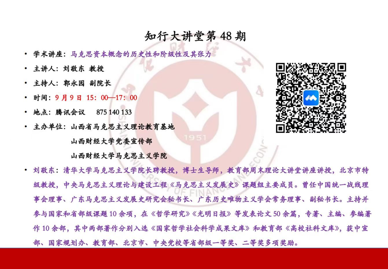 9月9日晚,由山西省马克思主义理论教育基地主办,党委宣传部、yl7703永利集团官网承办的知行大讲堂第48期以网络研讨会的形式顺利举行。中央马克思主义理论与建设工程专家、北京市特级教授、清华大学马克思主义学经理聘教授、博士生导师刘敬东教授作了题为《马克思资本概念的历史性和阶级性及其张力》的精彩报告。yl7703永利集团官网师生、思政工作骨干以及国内兄弟院校师生500余人通过腾讯网络研讨会参加此次学术讲座。讲座由yl7703永利集团官网副经理郭永园主持。
