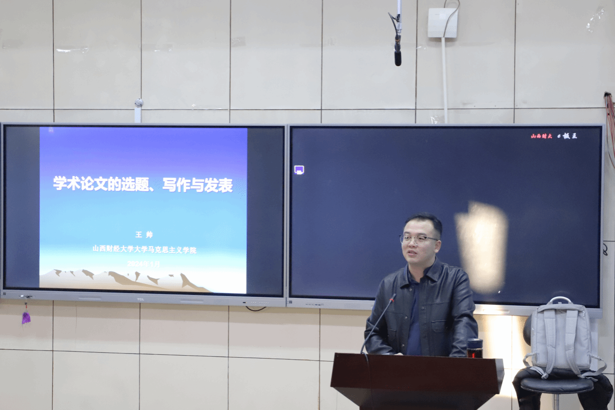 讲座主要围绕学术论文的选题、题目拟定与框架构思、学术论文的写作、学术论文的投稿与发表四部分展开。首先,王老师结合自身博士论文选题和发表核心期刊文章的过程,为同学们介绍了学术论文选题的方法,王老师指出,一方面要注意学科论文选题的权威依据,例如官方权威文件和习近平总书记系列重要讲话读本,另一方面要关注社科基金项目与核心期刊的内容,以此作为学位论文选题的参考对象。其次,王帅老师介绍了题目的拟定与框架构思,他强调到论文题目要以小见大,切忌过于空泛,难以把握,且确定论文题目前必须在前期阅读大量的文献,做好笔记,为之后的论文写作积累素材。在框架构思方面,他用一些例子向同学们分享了发生论、历史论、体系论等几种常见的研究维度,讲述了“三重逻辑论析”“三维度审视论析”“内在机理与实现路径”“现实问题研究”四种论文框架类型。之后,王老师对论文具体写作方法进行了详细阐述,他从一篇论文的摘要、关键词、正文到最后的注释和参考文献分别给出自己的建议,提出论文写作应坚持的四点原则,其中,针对马克思主义中国化和思想政治教育方向的同学,他特别讲到:“要注意论文的时效性,抓住时效就是抓住机遇。”最后,王帅老师向同学们介绍了论文投稿与发表需要注意的事项,对于同学们在论文写作时遇到的一些问题,他指出:“临渊羡鱼,不如退而结网。”以这句结语勉励同学们扎根学术前沿,立足专业基础,以饱满的热情投身到学术研究中去。