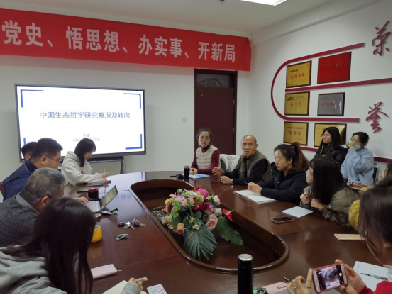 在本次活动中,王雯老师以“中国生态哲学研究概况及转向”为题展开了学术分享。首先,详细说明了“生态哲学”的基本含义,并对“环境哲学”和“生态哲学”两者概念区别进行了学术史的梳理;其次,从“生态本体论”、“生态认识论”和“生态价值论”三个方面详细说明了中国生态哲学理论的发展概况;最后,提出了中国生态哲学的新转向,即基于现实性的生态实践,构建中国特色的生态哲学范式的重大意义。