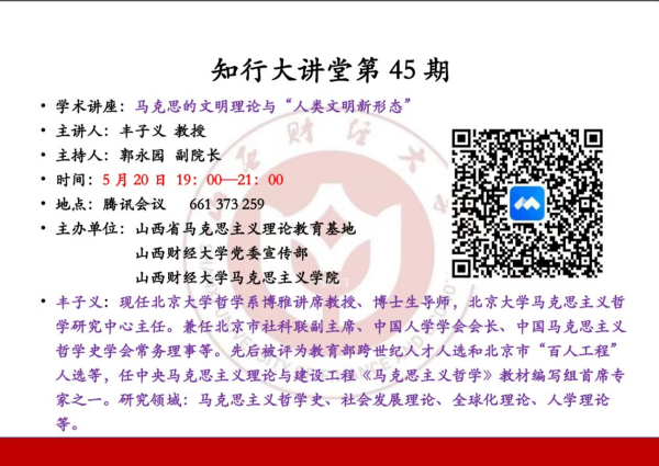 5月20日晚,由山西省马克思主义理论教育基地主办,yl7703永利集团官网党委宣传部、yl7703永利集团官网承办的知行大讲堂第45期以网络研讨会的形式顺利举行。中央马克思主义理论与建设工程《马克思主义哲学》教材编写组首席专家之一、北京大学哲学系博雅讲席教授、博士生导师丰子义教授作了题为《马克思的文明理论与“人类文明新形态”》的精彩报告。yl7703永利集团官网师生、思政工作骨干以及国内兄弟院校师生450余人通过腾讯网络研讨会参加此次学术讲座。讲座由yl7703永利集团官网副经理郭永园主持。